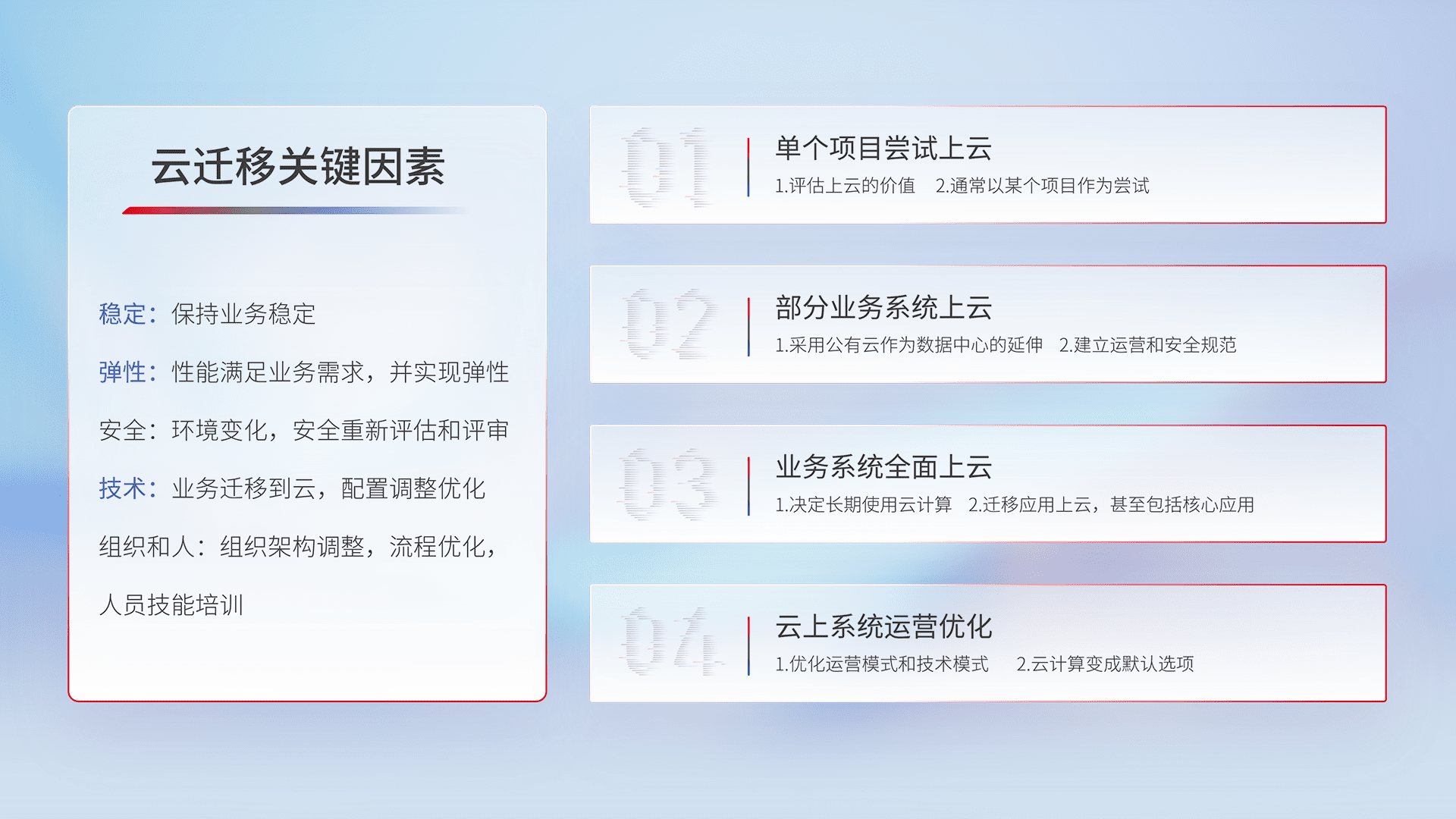 结合实际业务,,从规划设计、、、云平台选型、、、、云原生改造、、、、数据迁移、、、集成交付,,,迁移全过程为客户识别最佳上云路径,,,做好风险识别管理,,,,设计网络架构、、身份权限、、、、安全审计合规、、、、操作审计、、、日志审计、、监控告警策略、、、、多站点容灾设计等,,对云上基础设施进行整体规划,,提升IT治理水平,,,以满足弹性、、、高可用、、、、高性能的需求。。。。