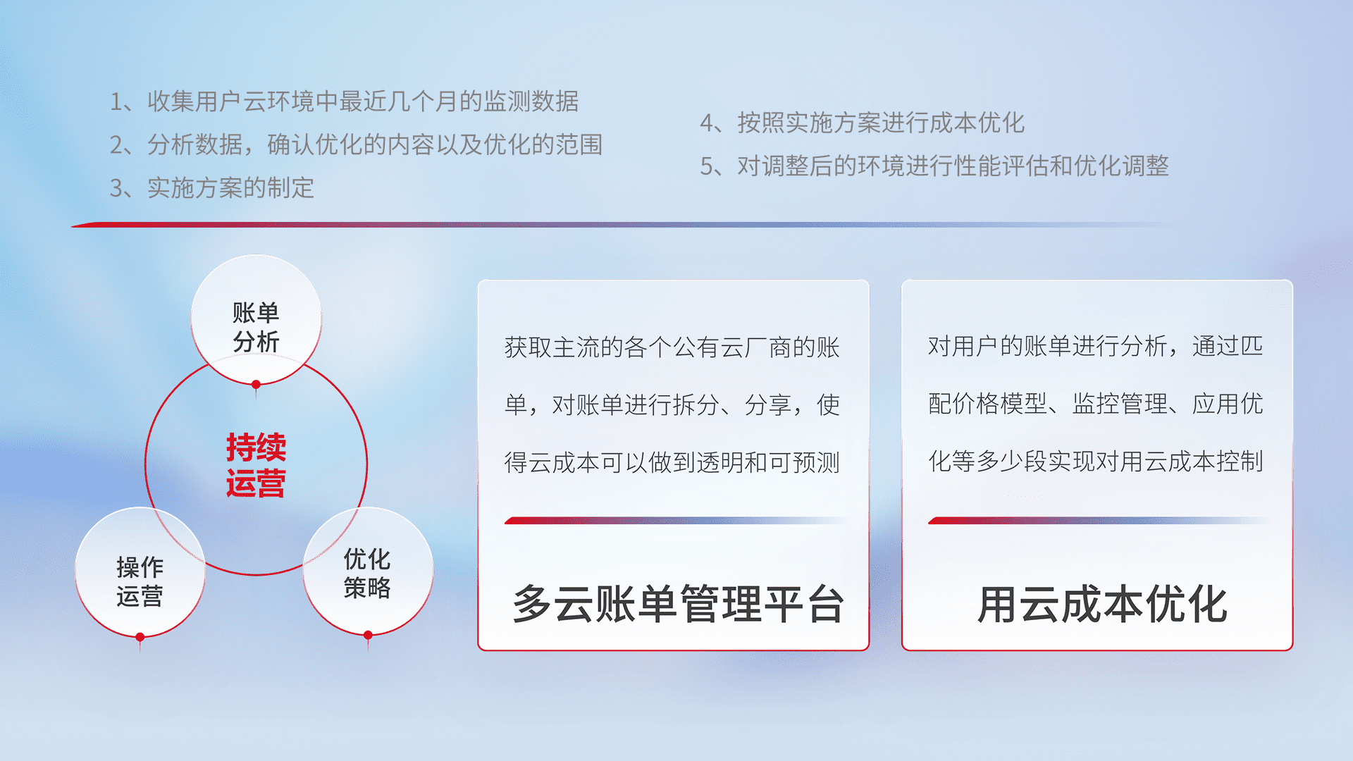 通过多云纳管,,,,以统一的资源数据模型把客户的云资源进行抽象和封装,,进而实现对多云资源的统一操作,,,,保障云资源管理的可靠性、、、、稳定性与可用性。。。量身定制化运维内容,,配置、、、、开发运维、、、、补丁管理、、、、备份、、监控、、、、认证和访问管理、、、、审计和日常巡检等,,,,保障在用云过程中的可靠度,,稳定度以及高可用率。。